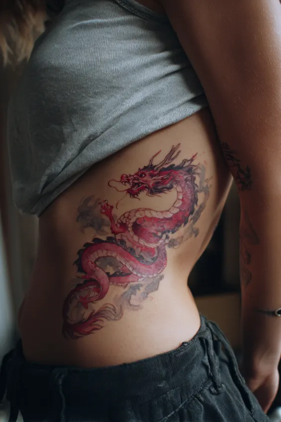 Rib tattoos always feel intimate to me, and adding a watercolor dragon makes it even more special. It feels artistic and deeply personal. I love how it looks both delicate and bold at the same time.