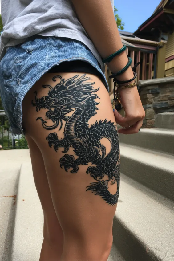 The final tattoo in this set is a large black dragon covering much of the outer thigh. The scales are heavily detailed, and the dragon’s pose feels dynamic and strong. The size makes it impossible to ignore, and the solid blackwork adds intensity.