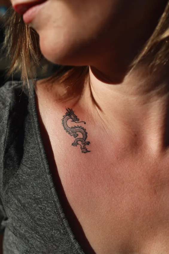 This first tattoo is a small black ink dragon resting just below the collarbone. The design is fine line with subtle detailing in the scales and tail, giving it a soft yet defined look. It follows the natural curve of the collarbone beautifully, almost like it was meant to live there. The size keeps it delicate, while the dark ink makes it stand out against the skin in the most elegant way.