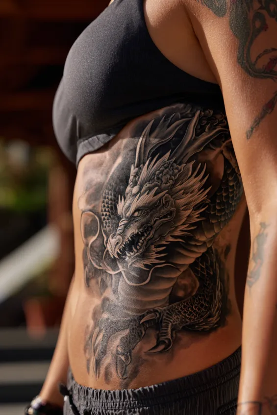 This tattoo is a large black and grey realism dragon spanning across the ribcage and side torso. The shading is incredibly detailed, especially in the scales and facial features, giving it a lifelike depth. The dragon stretches along the natural curve of the waist, enhancing the body’s shape while making a bold statement.
