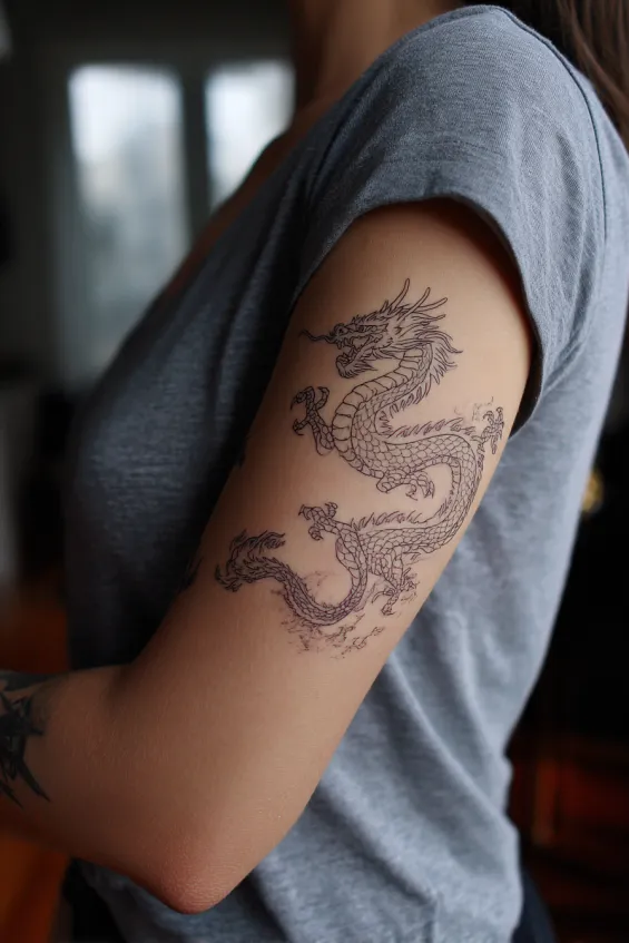 Soft Fine Line Dragon Upper Arm Tattoo