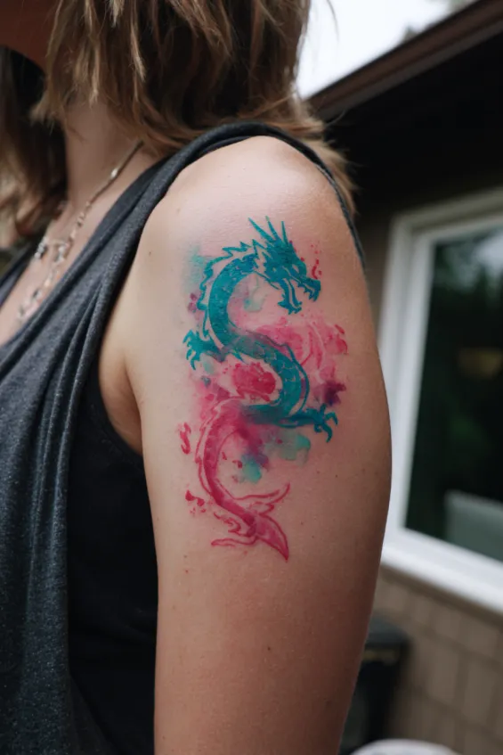This second piece is a medium sized watercolor dragon on the upper arm, bursting with shades of teal and pink. The colors blend softly like brushstrokes, giving the dragon movement and personality. The outline is subtle, allowing the watercolor effect to shine while still keeping the shape clear and bold. It curves naturally with the arm, making the placement feel organic and flattering.
