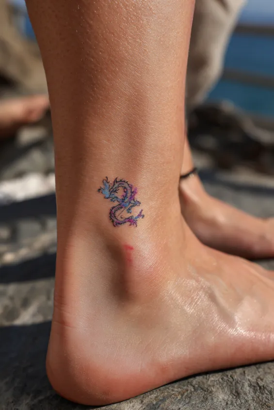 This small ankle tattoo features a miniature dragon in soft blue and purple tones. The design is simple but playful, with just enough color to make it pop. It sits neatly above the ankle bone, adding a subtle touch of personality.