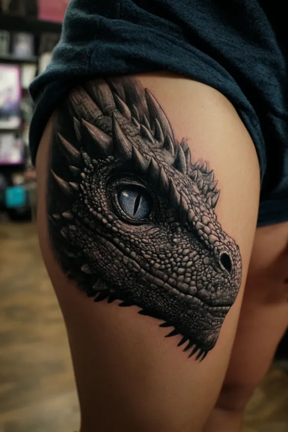 This final design features a large, highly detailed dragon head on the outer thigh. The realism is striking, especially in the eye and textured scales. The shading gives it a three dimensional feel that almost makes it look alive.