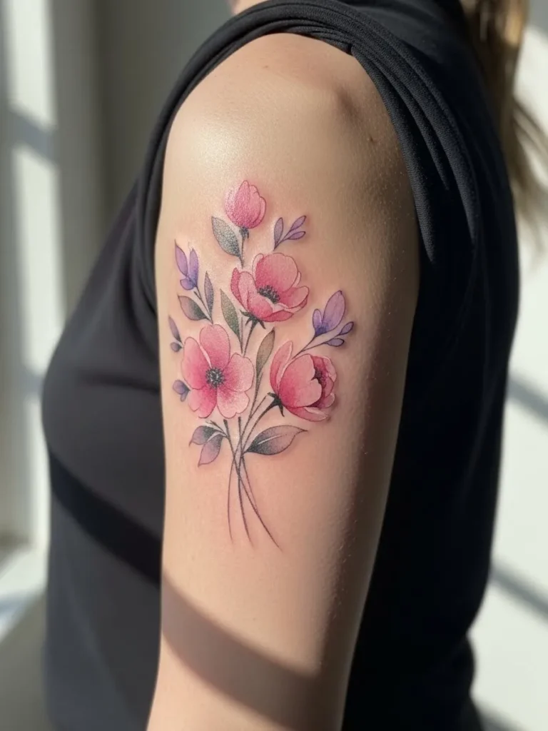 This watercolor floral tattoo sits softly on the upper arm and feels light and airy against the skin. The design features pink blossoms with muted purple accents and slender stems that flow naturally with the arm’s curve. The lines are delicate and minimal while the color washes bleed gently into the skin like real watercolor paint. The size feels medium and balanced, making it noticeable without overpowering the placement.