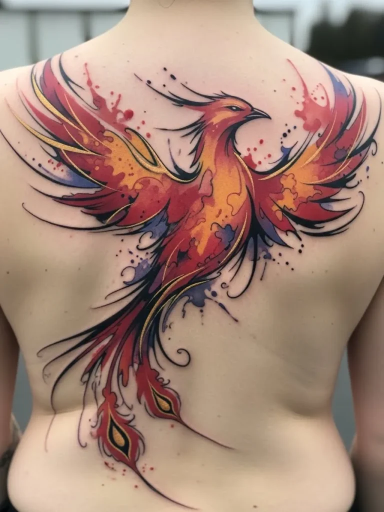 This large watercolor phoenix tattoo spans across the upper back, with wings stretching wide and flowing into bold brush strokes. Fiery reds, oranges, and deep blues blend together with dramatic splashes of color and fine black linework. The tail feathers cascade downward in an elegant curve, giving the entire piece a sense of motion. The size is large and statement making.