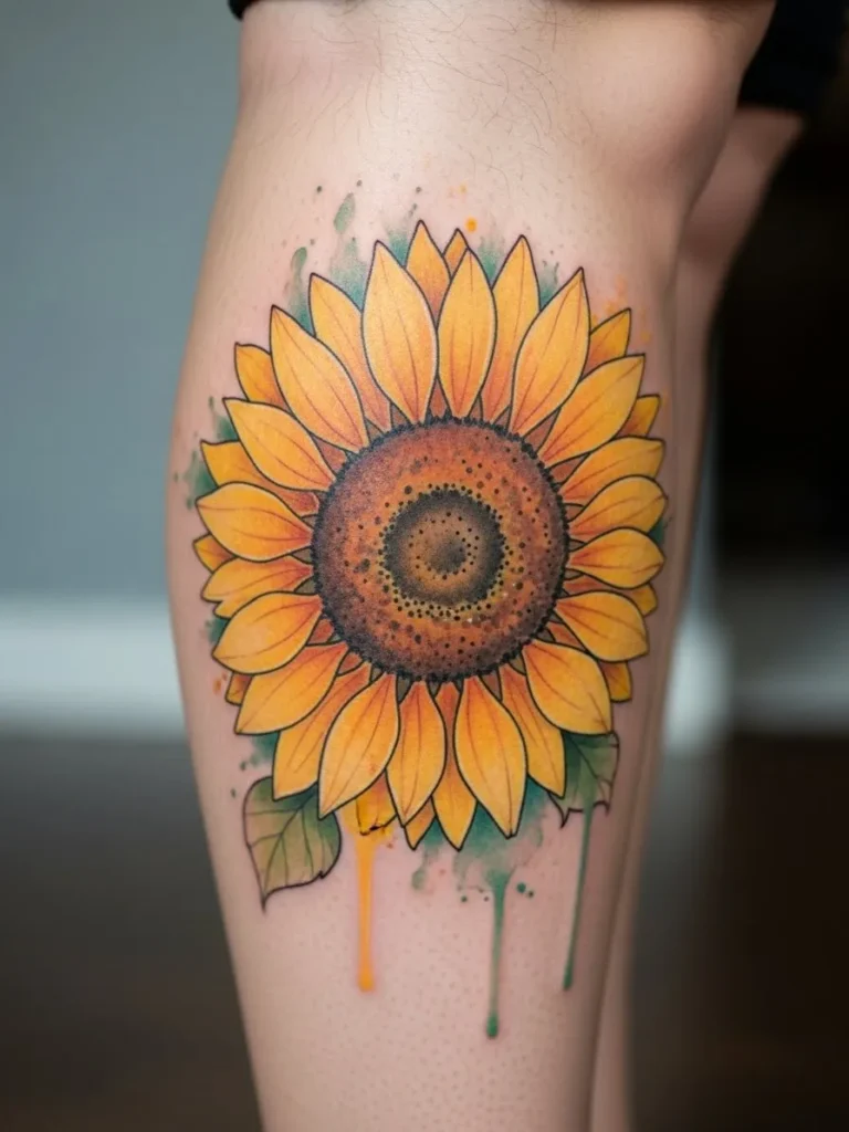 This sunflower tattoo is placed on the calf and uses the shape of the leg to showcase its bold round form. Bright yellow petals surround a textured center, accented with soft green watercolor washes in the background. Thin drips of paint fall below the flower, adding a playful artistic touch. The size is medium to large and very eye catching.