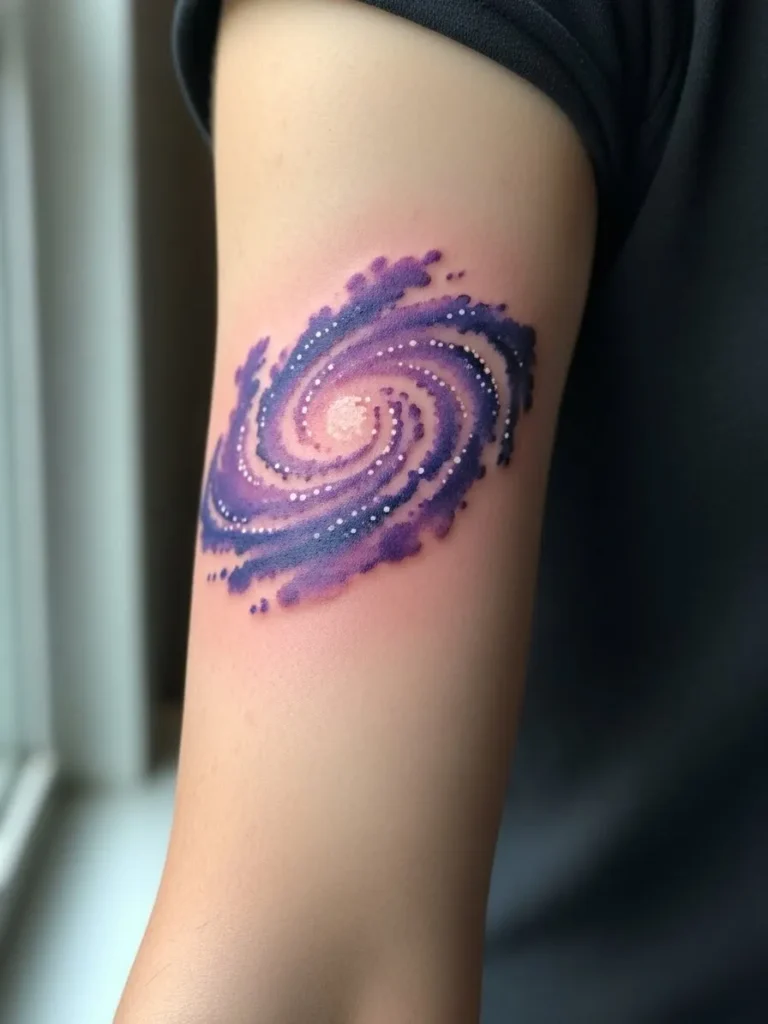 This galaxy tattoo sits on the upper arm and forms a soft spiral that feels almost cosmic. Deep purples and blues blend into lighter pinks at the center, dotted with tiny white highlights that mimic stars. The watercolor texture keeps the edges soft and organic. The size is medium and perfectly balanced for the placement.