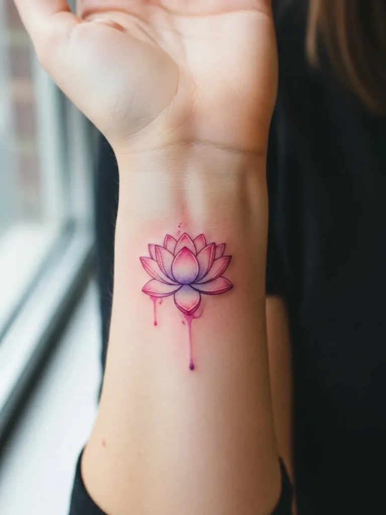 This small lotus tattoo sits delicately on the inner wrist, perfectly centered and easy to admire up close. Soft pink and purple tones blend seamlessly through the petals, creating a gentle watercolor fade with fine line details for definition. Subtle paint drips trail downward, giving it that freshly painted look. The size is small and refined, ideal for a minimal yet meaningful placement.