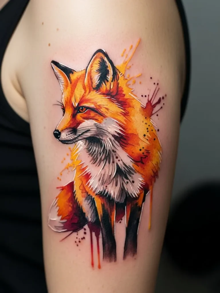 This watercolor fox tattoo is placed on the upper arm and feels bold without being overwhelming. Rich orange, rust, and warm brown tones blend into one another with painterly splashes and soft drips. Fine black lines define the fox’s features, especially the eyes and fur texture. The size is medium, giving the design room to feel alive and detailed.