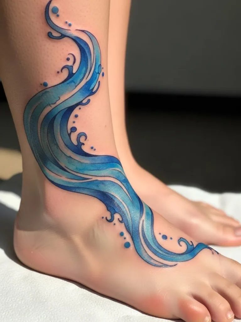 This wave tattoo wraps gracefully around the ankle and flows down onto the foot, following the natural movement of the body. Layers of blue and teal watercolor washes create depth and motion, while clean linework keeps the shape crisp. Small droplets and curves add a sense of rhythm. The size is medium and elongated, making it feel dynamic and elegant.