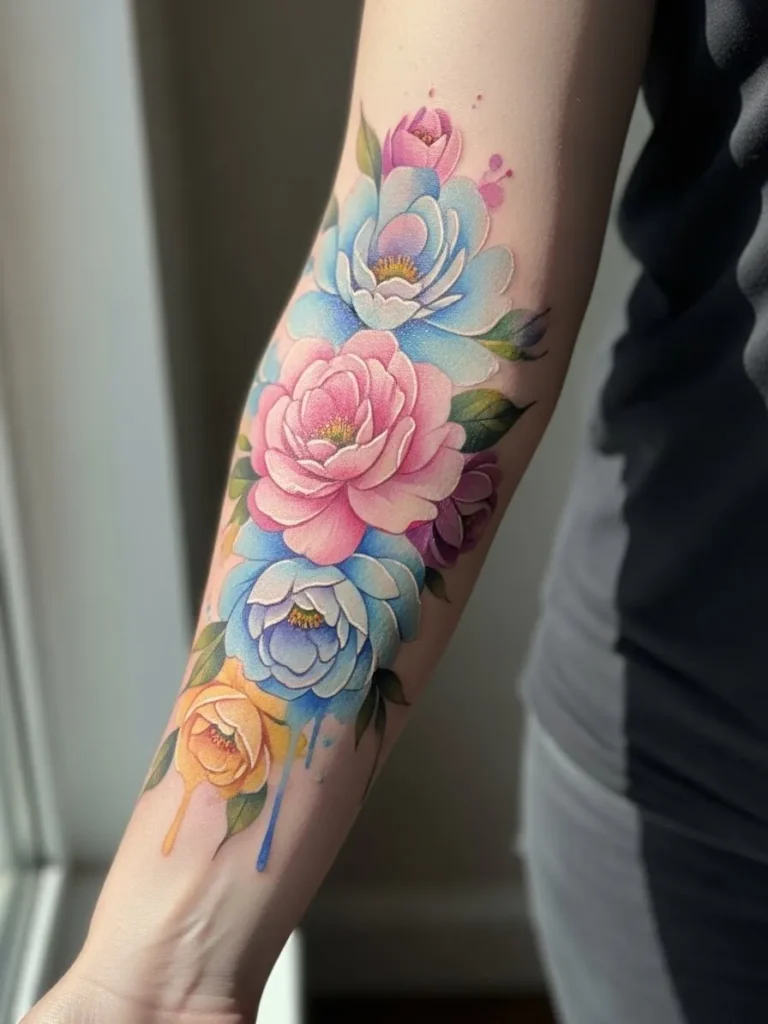 This floral tattoo runs along the forearm and features layered blooms in soft pinks, blues, and warm peach tones. Each flower is defined with delicate outlines while the watercolor fills blend naturally into one another. Gentle paint drips and soft shading give it a true painted look. The size is medium to large, perfect for showcasing detail.