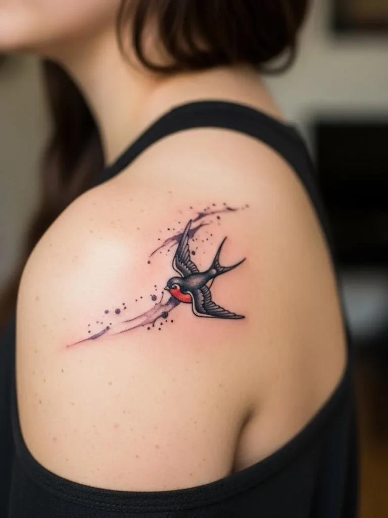This small swallow tattoo is placed on the upper shoulder and feels light and airy. Fine black lines define the bird’s shape, while soft watercolor splashes trail behind it in muted purples and grays. The design feels delicate and intentional. The size is small and subtle, perfect for a quiet statement.