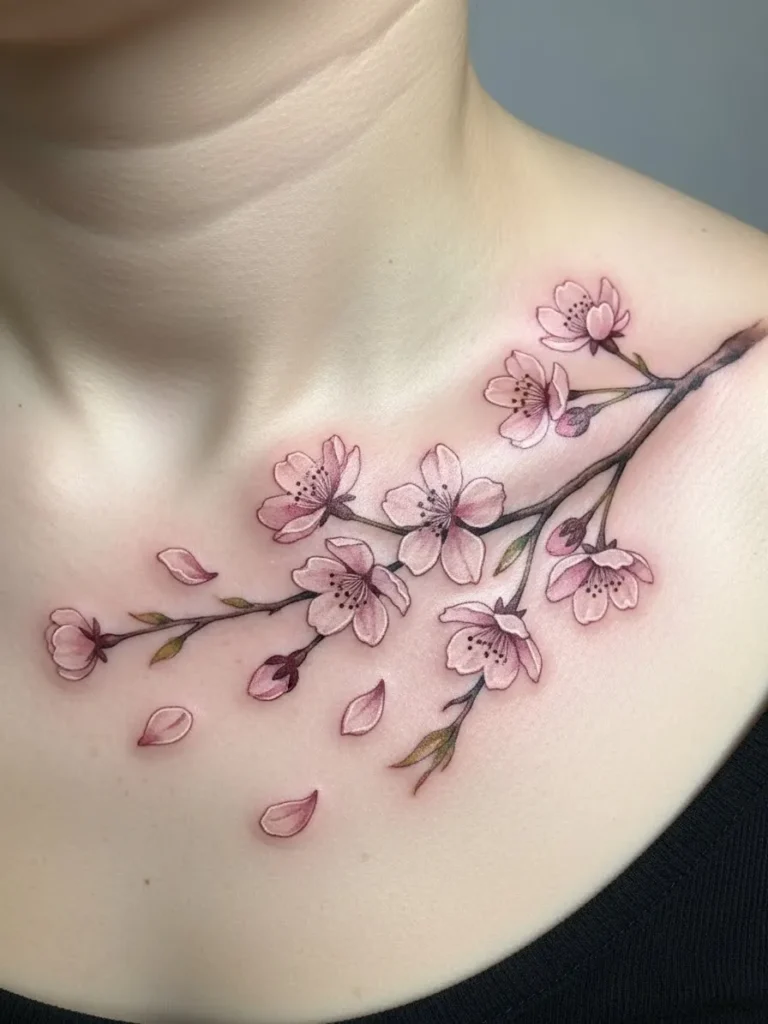 This cherry blossom tattoo stretches gently across the collarbone, following the natural curve of the shoulder. Pale pink blossoms bloom along a thin branch with tiny petals drifting downward. The watercolor shading is soft and airy, with subtle depth in each flower. The size is medium and beautifully balanced for the placement.