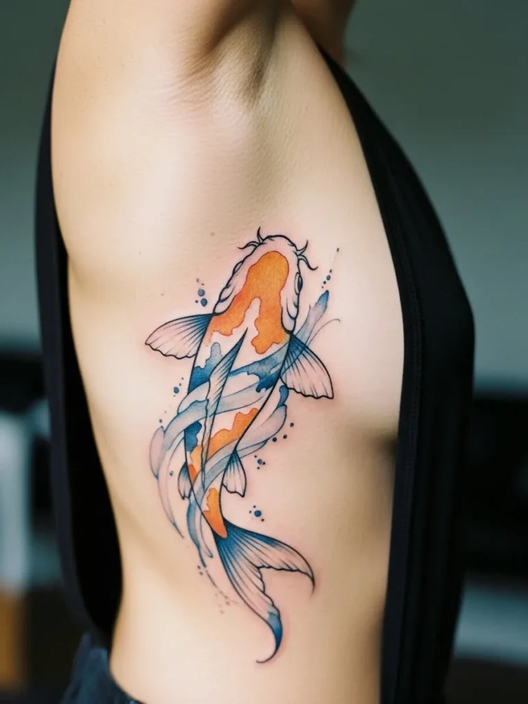 This koi fish tattoo is placed along the side of the upper arm, following the natural line of the body in a graceful vertical flow. Soft blues, warm orange tones, and fine black outlines come together in a fluid watercolor style that feels almost weightless. The fins fade into painterly brush strokes with tiny ink splashes that add movement and depth. The size is medium to large, giving the fish space to feel alive.