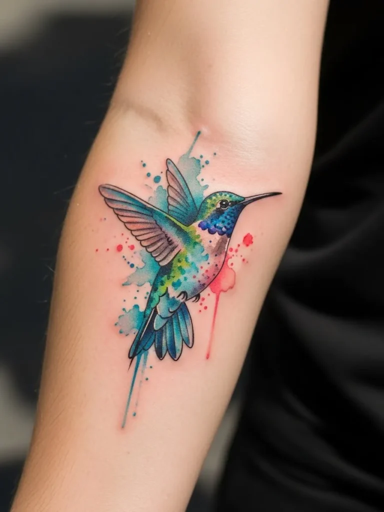 This hummingbird tattoo sits on the inner arm and bursts with color and motion. Bright blues, greens, and hints of pink blend together with expressive watercolor splashes and gentle drips. Fine linework keeps the wings and beak crisp while the colors stay loose and painterly. The size is medium and eye catching.