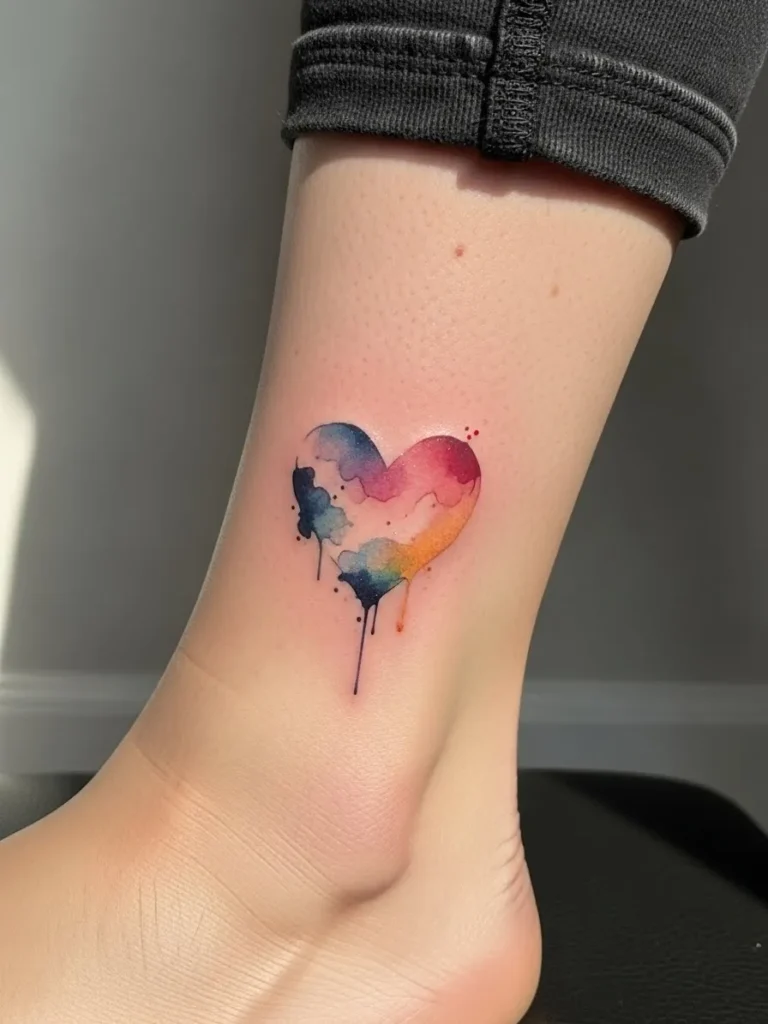 This small watercolor heart tattoo is placed near the ankle, which makes it feel intimate and sweet. The heart is filled with blended rainbow hues that melt into one another, finished with soft ink drips that trail downward. The edges are loose and painterly, giving it that freshly painted look. The size is small but the colors make it pop beautifully.