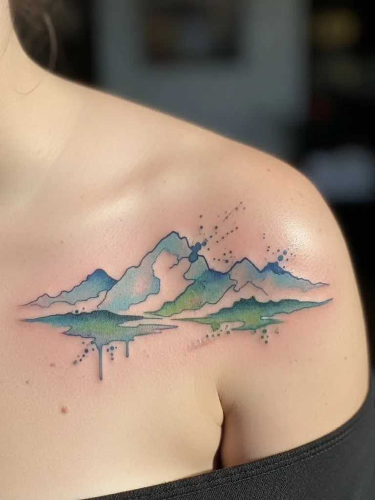 This watercolor mountain tattoo stretches gently across the upper back near the shoulder. The landscape is made up of soft greens and blues layered in a hazy watercolor style. Subtle splatters and paint drips add texture while keeping the overall look calm and dreamy. The design is medium in size and sits beautifully across the shoulder line.