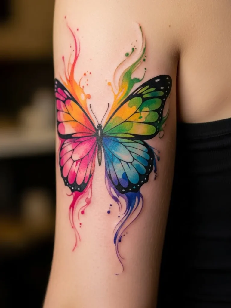 This butterfly tattoo is placed on the upper arm and spreads its wings wide in a bold but elegant way. Bright rainbow colors blend seamlessly across the wings, framed by fine black details that keep the shape crisp. Painterly splashes trail from the wings, giving the illusion of motion and transformation. The size is medium and perfectly balanced for showcasing detail.