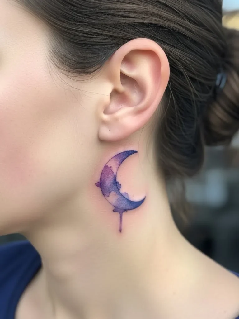This small crescent moon tattoo sits just behind the ear, making it subtle and softly enchanting. Shades of purple and blue blend together in a gentle watercolor wash, with a slight drip detail that adds character. The edges are soft and organic rather than sharp. The size is small and perfectly suited for such an intimate placement.