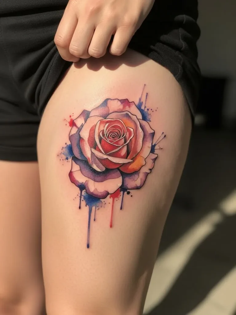 This watercolor rose tattoo is placed high on the thigh and instantly draws attention with its painterly depth. Soft blush pinks blend into warm reds and muted purples, layered with fine black outlines that define each petal. The watercolor washes spill outward with subtle splatters and intentional drips that trail down the skin. The size is medium and fills the area beautifully without feeling heavy.