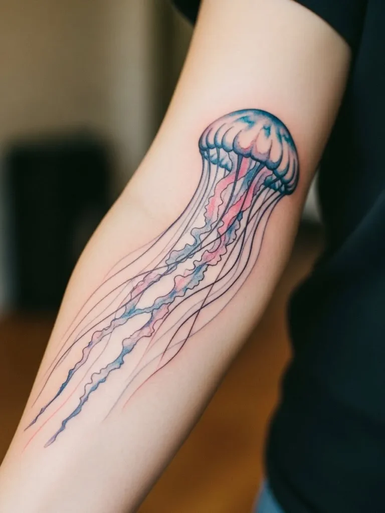 This jellyfish tattoo flows gracefully along the inner forearm, using the length of the arm to enhance its movement. Fine black lines create delicate tentacles while soft washes of blue, pink, and violet drift through the body like watercolor on wet paper. The design is airy and light with lots of negative space. The size feels medium but elongated, which makes it extra elegant.