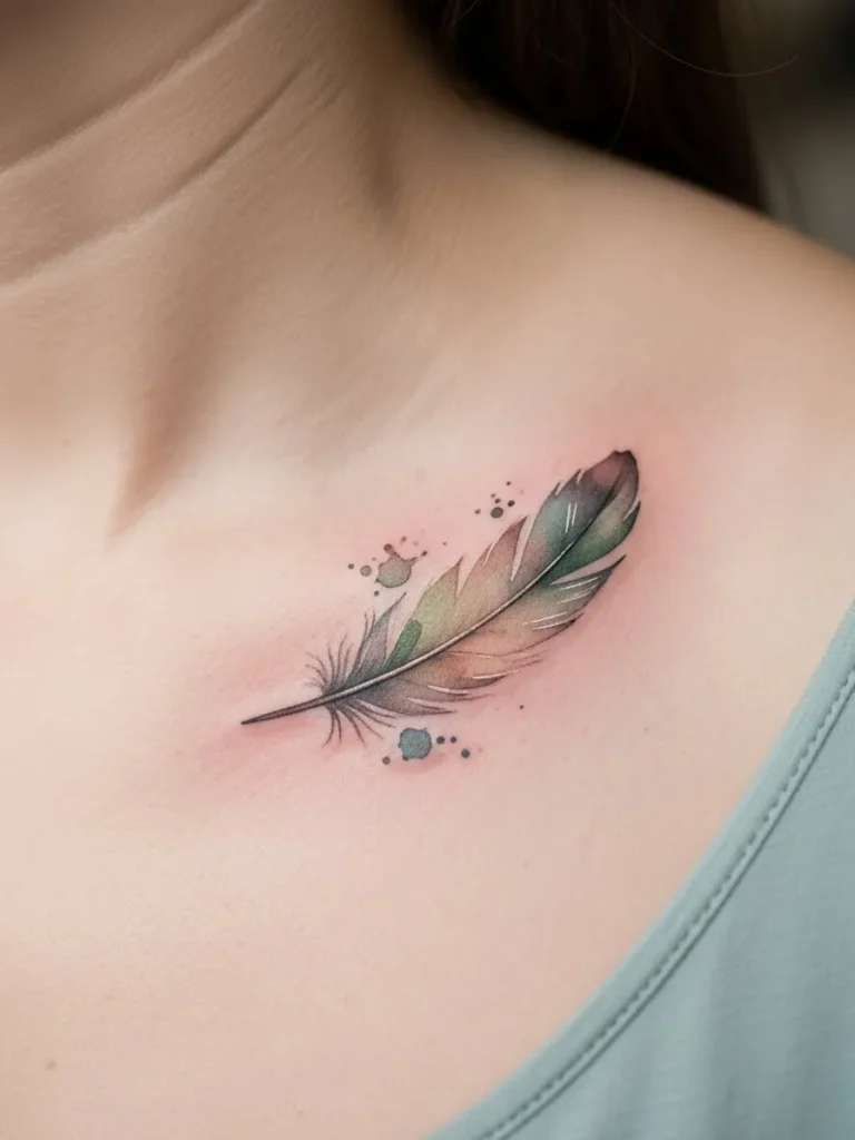 This small feather tattoo rests gently near the collarbone, following the natural line of the skin. Muted greens, warm browns, and soft gray tones blend together in a subtle watercolor style. Tiny paint splashes add texture without distracting from the feather’s fine details. The size is small and delicate, perfect for an understated look.