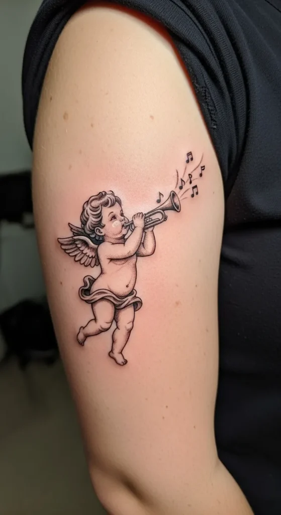 I honestly can’t get over how much personality is packed into this little guy. There is something so joyful about the idea of a tiny angel literally blowing its own horn. It feels like a celebration of finding your own voice or maybe just a sweet nod to a love for music. I find the placement super flattering because it draws the eye up and makes the arm look toned and elegant. It is the kind of tattoo that feels timeless but still has a playful spark that makes you want to smile every time you catch it in the mirror.