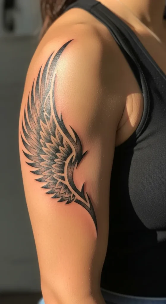 This striking upper arm piece features a single, stylized angel wing that beautifully blends traditional feathering with sharp tribal aesthetics. The tattoo is perfectly placed on the outer deltoid, curving naturally with the shape of the shoulder and sweeping down toward the triceps. It uses heavy black ink for the bold outer outlines while incorporating softer grey shading inside the individual feathers to give it a sense of depth and movement. The size is substantial enough to make a statement but keeps a clean look by leaving plenty of open skin between the sharp, pointed accents.