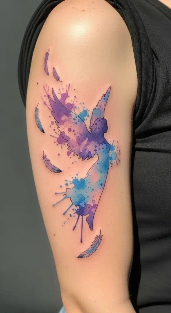 This vibrant upper arm piece features a graceful female angel silhouette captured in a bold watercolor style. The design flows beautifully along the deltoid and tricep area with a medium to large scale that makes a real statement. Instead of traditional outlines, the figure is defined by splashes and splatters of electric purple, deep indigo, and bright turquoise ink. To add a sense of movement, five detailed feathers float around the main silhouette, each carrying a subtle hint of those same dreamy cool tones.