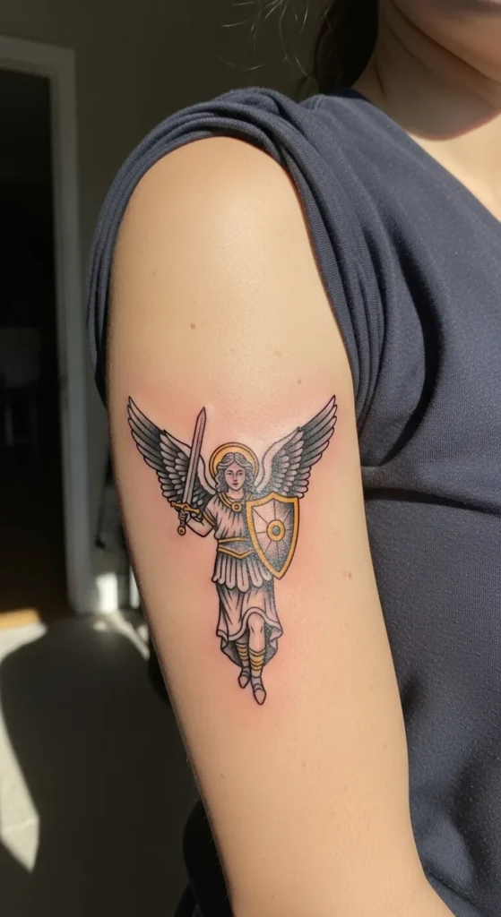 This tattoo sits perfectly on the outer deltoid of the upper arm and features a warrior angel that looks like she stepped straight out of a vintage storybook. The style blends traditional linework with some gorgeous stippling for shading, which gives it a textured and classic feel. It is a medium-sized piece that really makes use of the flat canvas of the arm. The color palette is super sophisticated with mostly black and grey tones, while tiny pops of gold on the halo, sword hilt, and shield border add just the right amount of shine to make the design pop against the skin.
