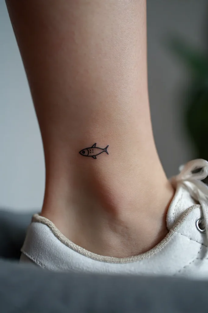 This small ichthys fish tattoo sits delicately on the outer ankle, right above the heel line. The design is clean and minimal, created with fine black ink and smooth, flowing lines that form the classic Christian fish symbol. Its petite size keeps it elegant and understated, making it perfect for everyday wear. The placement near the ankle gives it a soft, feminine feel that pairs beautifully with sneakers, sandals, or even bare feet.