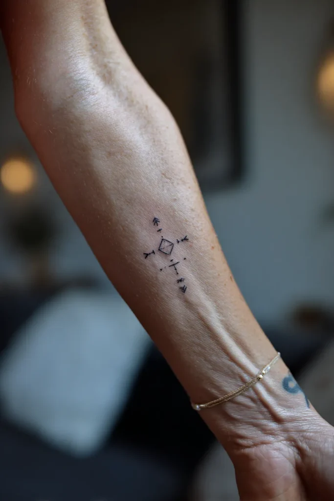 This tiny geometric tattoo sits gracefully on the inner forearm, designed with fine black lines that form a subtle compass shape. At the center is a small diamond, with delicate arrow like lines extending outward in four directions. The detailing is minimal and slightly abstract, giving it a modern, almost sacred symbol feel. Its petite size keeps it understated, while the clean linework makes it look crisp and intentional against the skin.