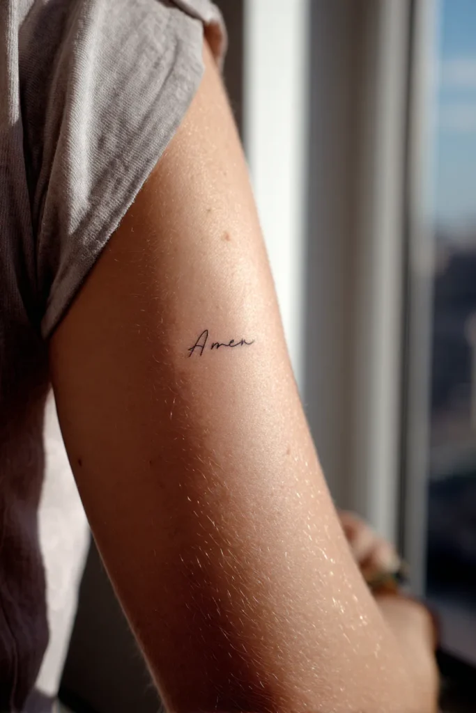 I find something so comforting about the word Amen on its own. It feels like a quiet exhale after prayer, a soft yes from the heart. For me, this kind of tattoo is a reminder of trust and surrender without needing a full verse or symbol. It is simple, meaningful, and beautifully intimate in a way that feels deeply personal every single day.