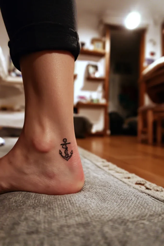 This delicate ankle tattoo features a small black ink anchor placed just above the heel, perfectly sized to feel intimate and understated. The design is minimal and fine lined, with a clean silhouette and subtle curves that keep it soft rather than bold. It sits low and close to the skin, almost like a secret symbol resting quietly near the foot, making it easy to show off in sandals or keep hidden when you want it to be just yours.