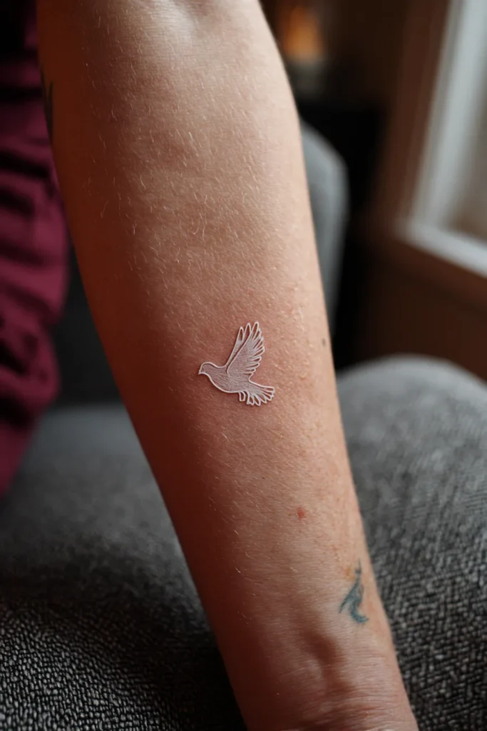 This tiny white dove is placed along the forearm, rendered in soft, light ink that gives it an airy, almost ethereal look. The bird appears mid flight, with delicate wings slightly lifted and subtle detailing that keeps it refined rather than bold. Its small scale makes it feel tender and intimate, while the pale coloring gives it a gentle glow against the skin.