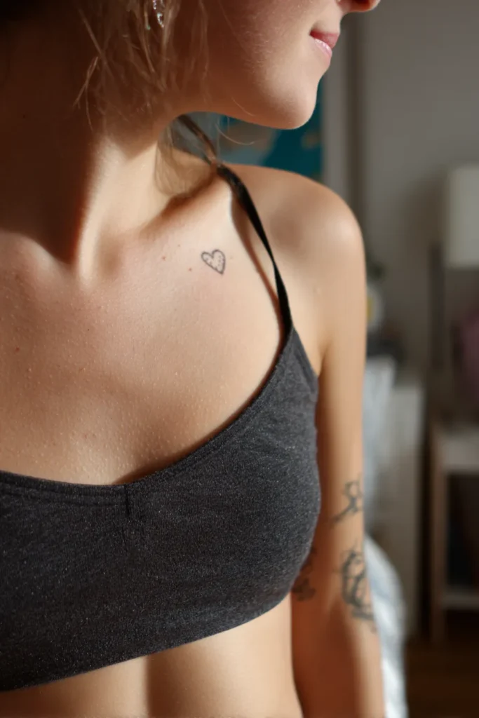 I adore collarbone tattoos because they feel both delicate and confident at the same time. A small heart here can symbolize God’s love in the most understated way. It feels romantic yet spiritual, like a private reminder that love is rooted in faith. I think this kind of tattoo is perfect for someone who wants meaning without anything loud or flashy.