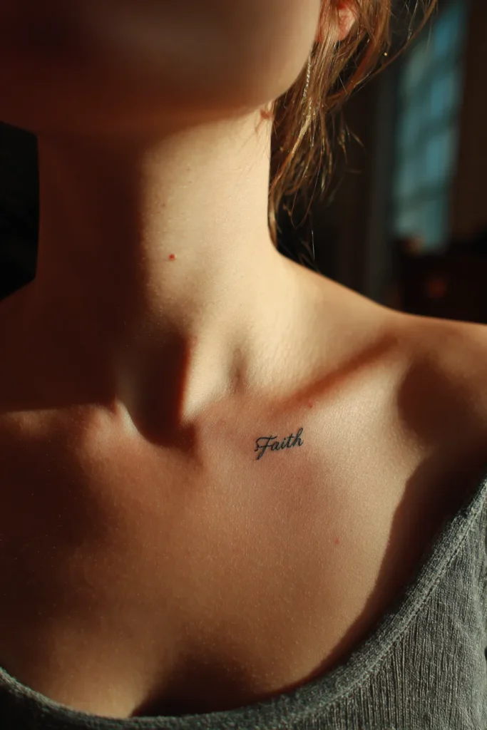 Tiny Faith Script Near The Collarbone