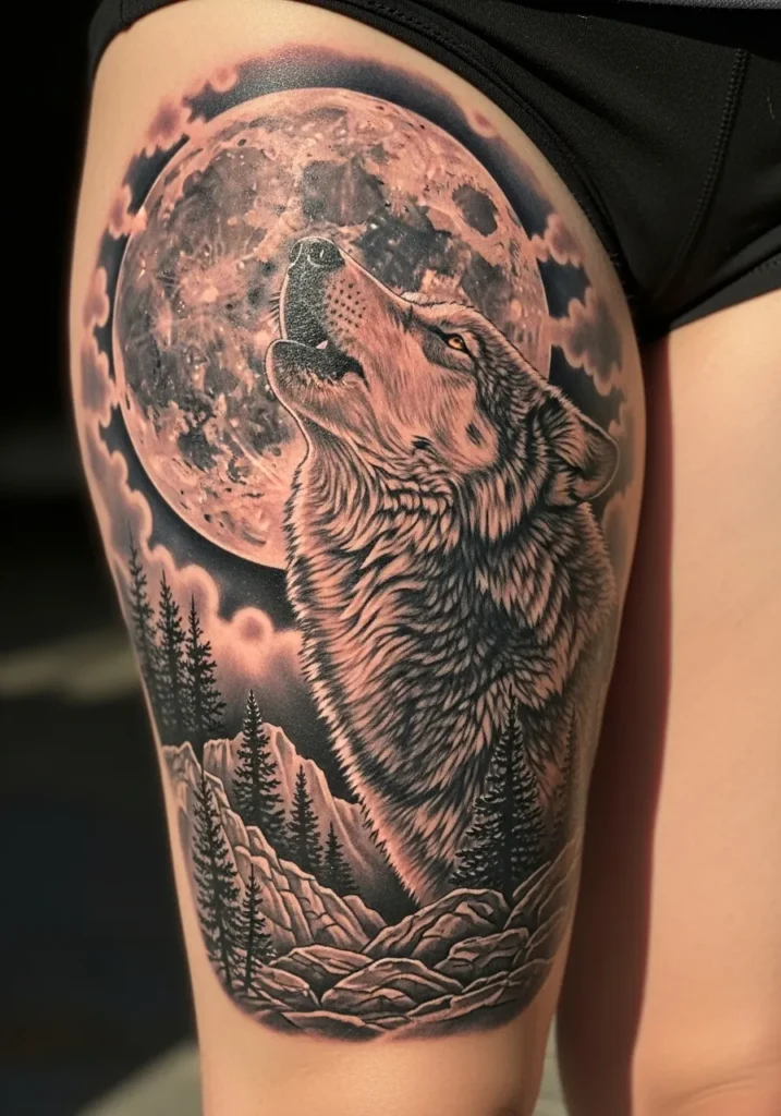 This stunning piece shows a howling wolf in front of a glowing full moon, surrounded by trees and mountains. The black and grey realism creates incredible depth, with subtle highlights that make the moon almost luminous. The placement on the thigh gives the design room to breathe, creating a powerful, dramatic effect.