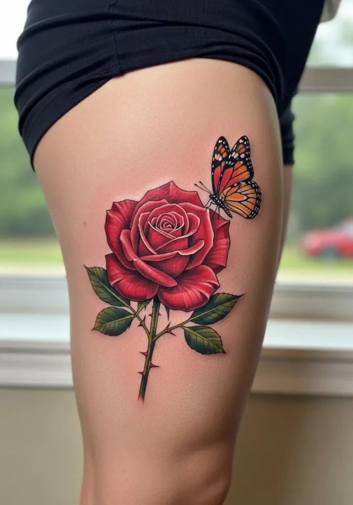 This bright realism tattoo pairs a deep red rose with a delicate orange and black butterfly resting softly on one of its petals. The fine shading gives the rose a velvety look, while the butterfly adds just the right amount of contrast and life. Placed neatly on the upper thigh, it feels timeless and effortlessly elegant.
