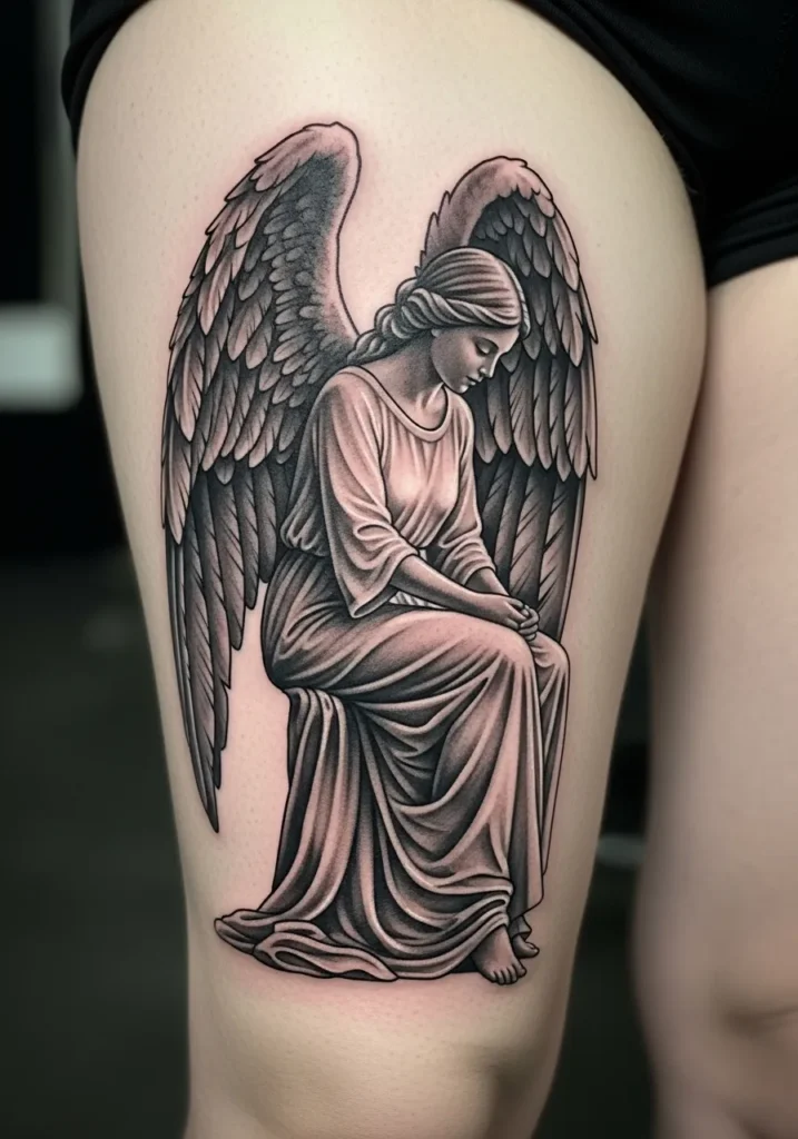 This black and grey thigh tattoo features a serene angel sitting gracefully with her wings folded behind her. The shading brings the folds of her gown and feathers to life, creating a sculpture-like realism that looks almost three-dimensional. The size and placement make it a truly eye-catching piece that still feels peaceful and soft.