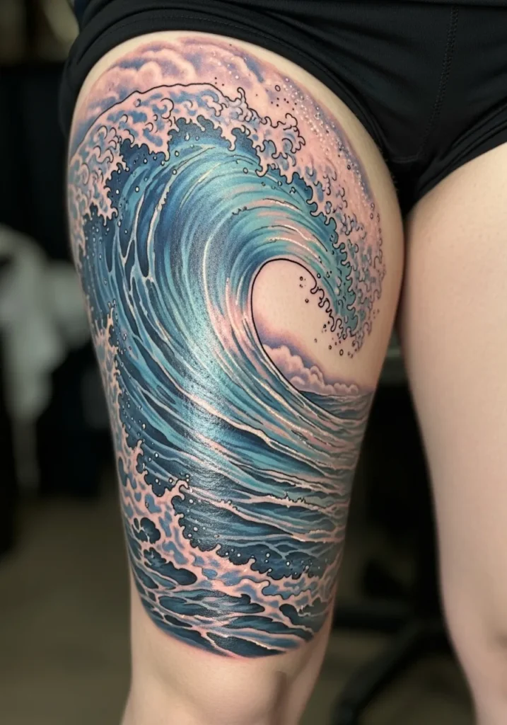 This stunning realism tattoo captures a crashing wave in motion, swirling across the thigh in shades of deep blue, turquoise, and soft pink. The fine detailing of each foam splash and ripple gives it a sense of power and movement, while the soft pastel undertones add a calming balance. The size and curve of the design flow naturally with the body’s shape, making it dynamic and beautifully placed.