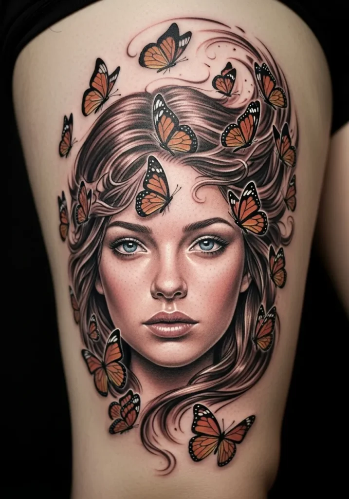 This gorgeous tattoo features a lifelike female portrait surrounded by fluttering monarch butterflies. The artist’s fine shading brings her skin tone and hair texture to life, while the vivid orange and black butterflies add color and movement. The placement on the upper thigh gives the whole piece a dreamy, flowing composition that feels artistic and feminine.
