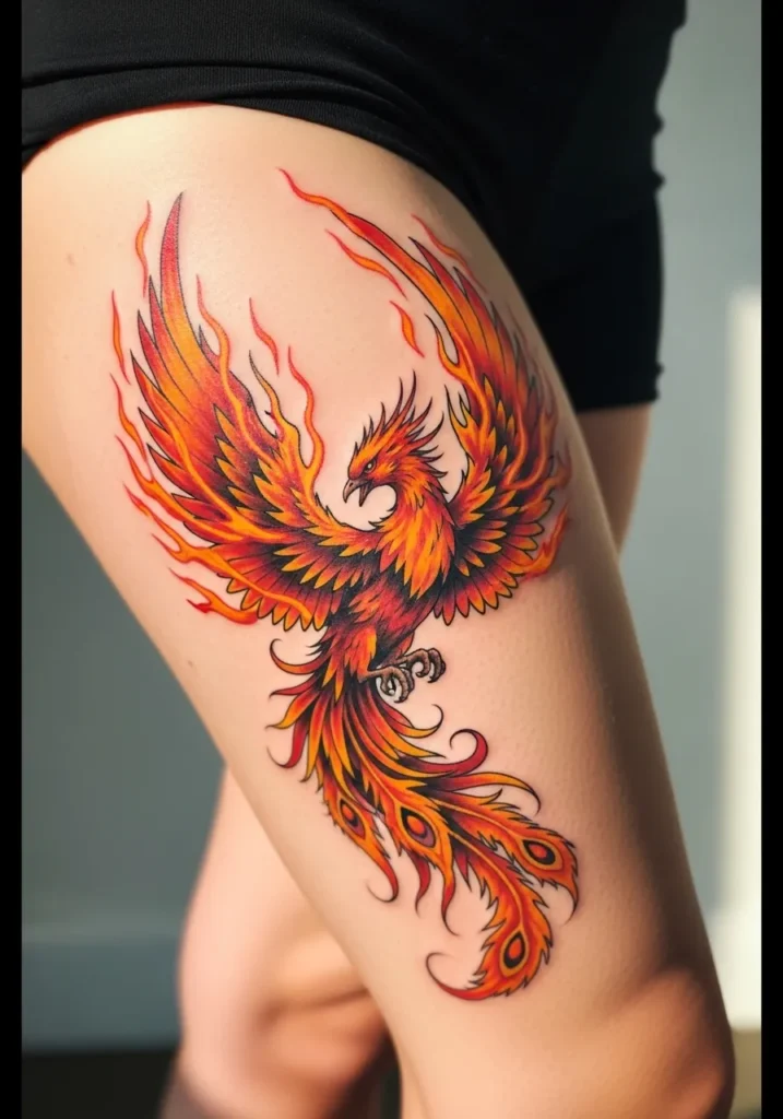 This fiery thigh tattoo depicts a majestic phoenix spreading its wings in vivid shades of red, orange, and gold. The realistic feathers glow with energy, and the flame-like shapes give it a sense of rebirth and motion. The design fits the thigh perfectly, making it bold and radiant without overwhelming the space.