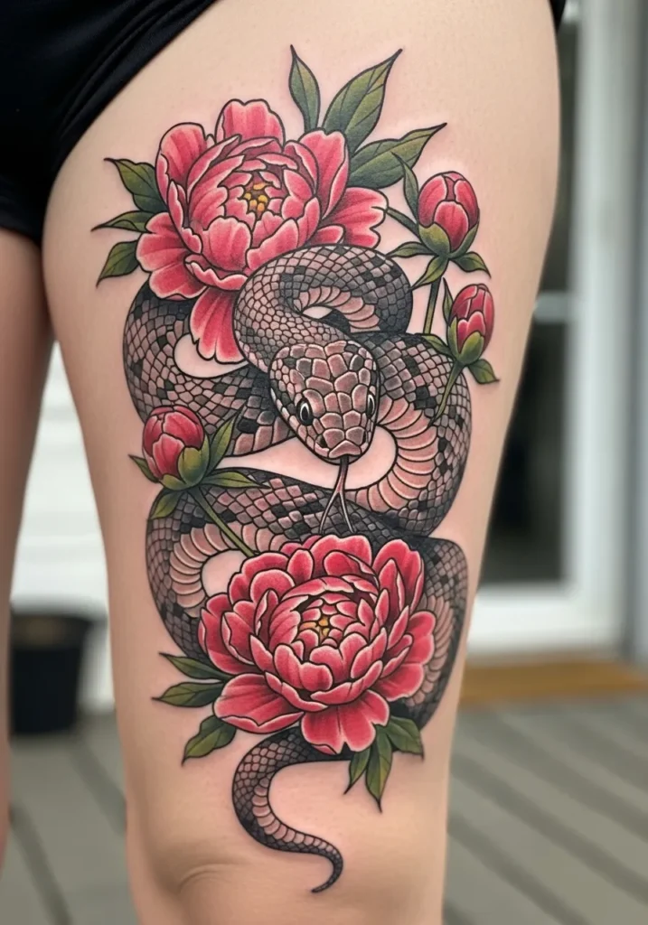 This elegant thigh tattoo showcases a coiled snake winding through blooming red peonies. The detailed scales and soft gradients give the snake a lifelike texture, while the flowers balance it with warmth and softness. The mix of earthy tones and vivid petals makes the composition visually striking yet harmonious.