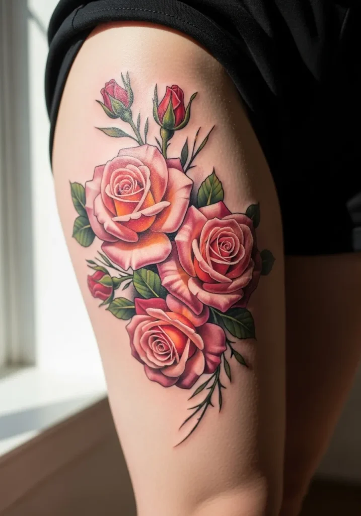This soft and romantic tattoo displays a cluster of pink roses with gentle shading that makes each petal look velvety and real. The placement on the upper thigh allows the bouquet to flow beautifully with the body’s curve, while the green leaves add depth and balance to the warm tones.