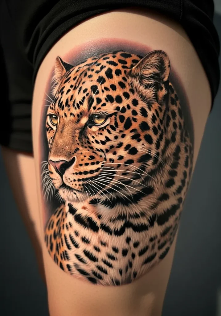 This hyper-realistic leopard tattoo captures the animal’s strength and grace in exquisite detail. The golden fur, precise black spots, and lifelike eyes make it seem like the big cat is quietly observing from the skin itself. The placement on the thigh adds to the bold impact, creating a fierce yet elegant statement piece.