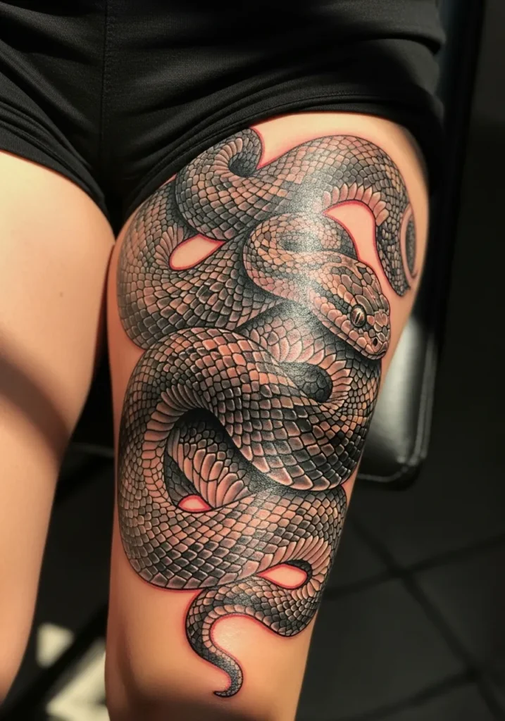 This realism-style snake tattoo winds elegantly across the thigh, its scales detailed with precise shading and soft color gradients that create a lifelike effect. The subtle touches of red outlining the coiled body add depth and drama, while the placement accentuates the thigh’s curves beautifully. The overall design feels sleek and commanding without being overly aggressive.