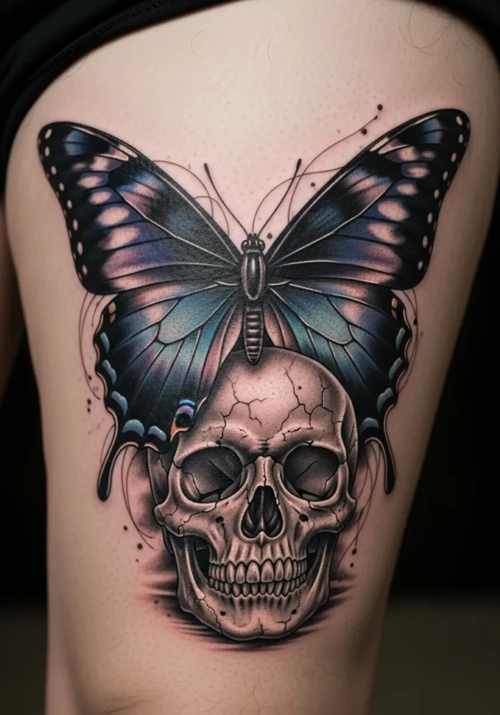 This piece combines a soft blue butterfly perched atop a cracked skull, merging life and death into one striking design. The butterfly’s shimmering wings contrast beautifully against the textured skull, giving it a balanced mix of darkness and light. The medium size fits the thigh perfectly, keeping it bold yet artistic.
