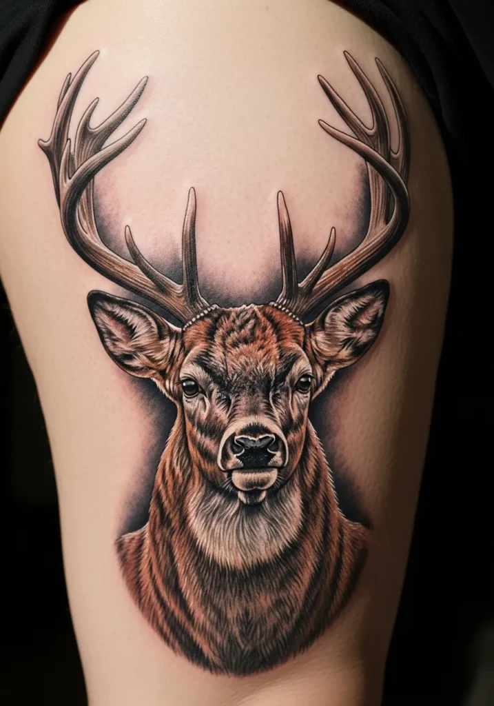 This lifelike deer tattoo features delicate antlers and warm brown tones that flow naturally across the thigh. The fine hair details and soft shading around the face make the design look incredibly realistic, giving it a calm, noble feel. It’s large enough to stand out without overpowering the leg.